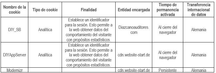 A través de la política de cookies DÍAZ-CANO AUDITORES Y CONSULTORES, S.L.U. pretende información acerca del tratamiento de sus datos que realiza a través del uso de “cookies” y/o tecnologías similares